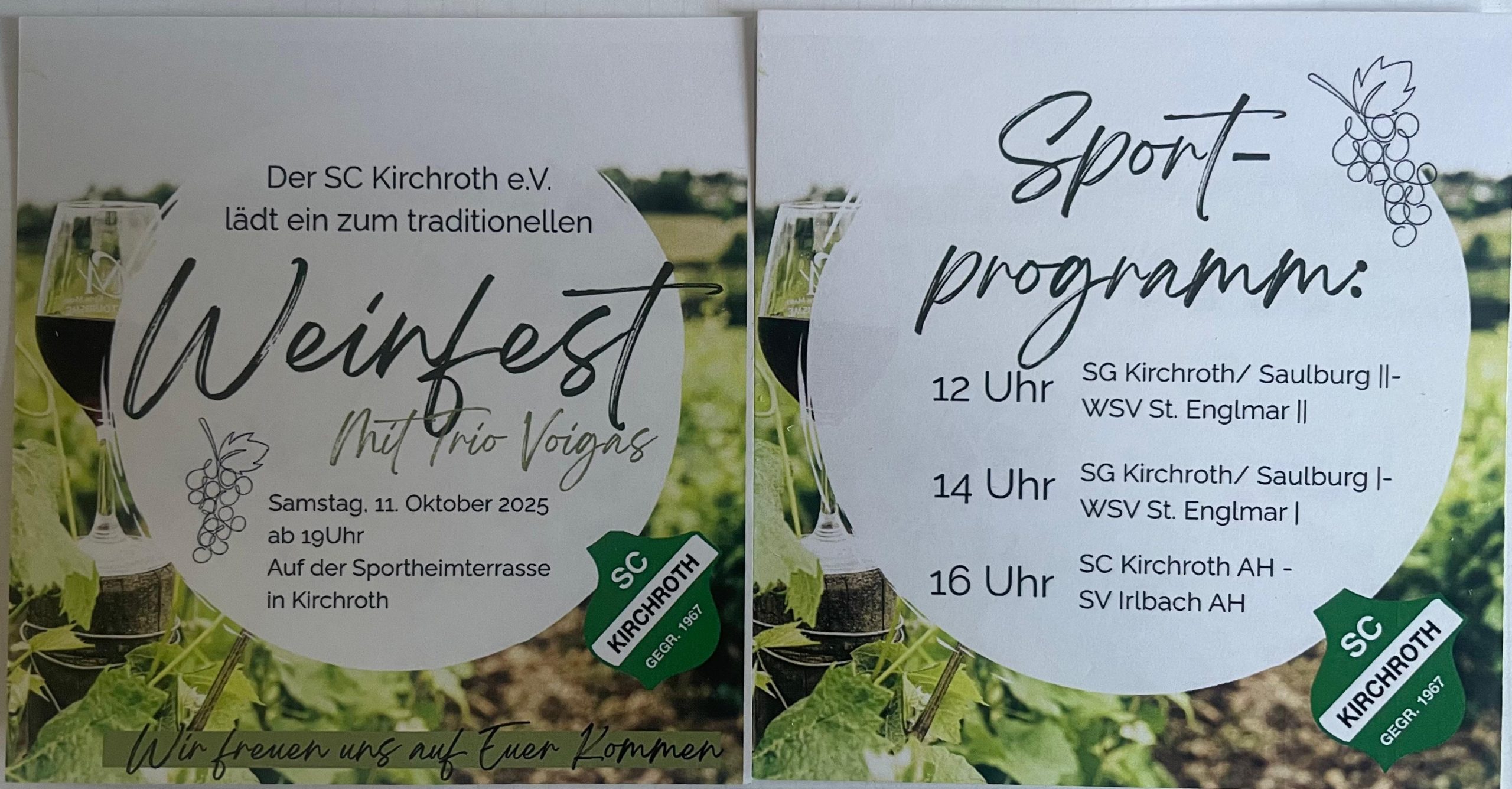Getreu dem Motto „Genuss im Glas – Freude im Herzen“ findet am Samstag, den 11.10.2025 wieder unser jährliches Weinfest im Sportheim Kirchroth statt. Mit im Programm wie auch im Jahr zuvor ist die Kultband TrioVoigas. Auf Euch warten wie immer erlesene Weine und bekannt gute Brotzeiten aus der Sportheimküche. Neben dem leiblichen wohl, kommen auch...
