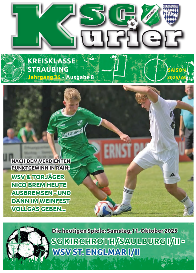 Alle aktuellen News zum Spieltag am Samstag, 11.10.2025 gegen den WSV St. Englmar, finden Sie bereits vorab im KSC-Kurier. Einfach mal über den angeführten Link reinklicken. Im übrigen finden Sie alle KSC-Kuriere in unserem Downloadbereich der Mediathek Jahrgang 36 – Ausgabe 8_WSV ST_Englmar
