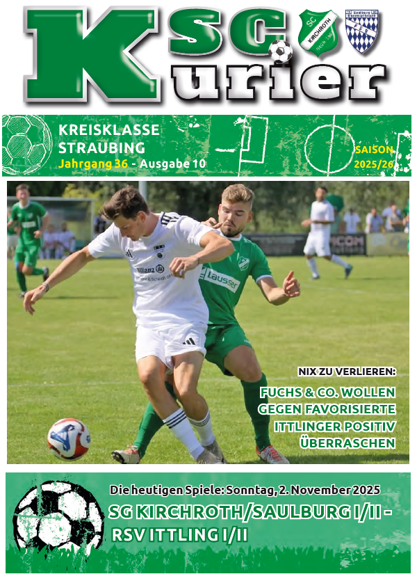Alle aktuellen News zum Spieltag am Sonntag, 02.11.2025 gegen den RSV Ittling, finden Sie bereits vorab im KSC-Kurier. Einfach mal über den angeführten Link reinklicken. Im übrigen finden Sie alle KSC-Kuriere in unserem Downloadbereich der Mediathek Jahrgang 36 – Ausgabe 10_RSV Ittling