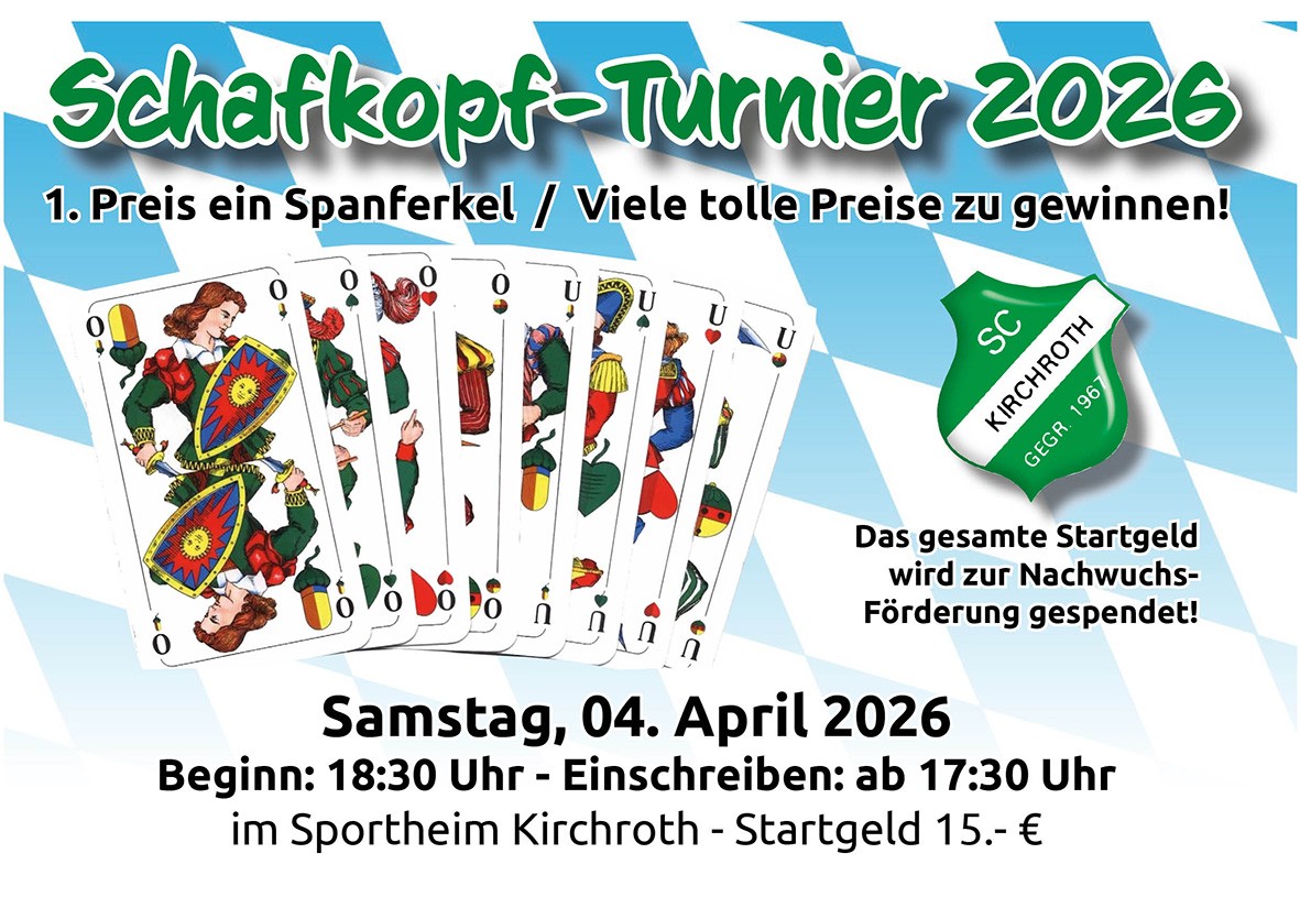 Am Samstag den 04.04.2026 findet wieder unser alljährliches Schafkopfturnier im Sportheim statt. Für alle Freunde des gepflegten Schafkopfs wieder die Gelegenheit, ihr Können zu beweisen, Karten zu klopfen und gemeinsam einen geselligen Abend zu genießen.